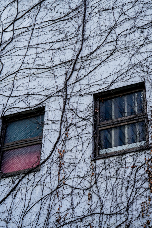 以前神楽坂で同じように蔦の絡まる家を見ました。 九段坂の横道を入った所のビルでしたが黒い蔦の流は画家ベルナール・ビュッフェの黒い線を思い出さました。春先の芽吹き 秋の紅葉が楽しみな蔦です。